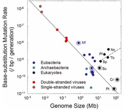 드레이크의 법칙(Drake's rule)이라는 것이 있다. DNA를 유전물질로 갖는 반수체 미생물의 경우 전체 유전체에 대한 돌연변이율은 매우 일정하다는 것이다. 1991년 미국립과학원회보(Proceedings of National Academy of Sciences USA)에 실린 드레이크의 단독 저자 논문 'A constant rate of spontaneous mutation in DNA-based microbes'에 의하면 1번 분열하여 세포가 둘로 늘어날 때 유전체 전체에 걸쳐서 발생하는 돌연변이의 평균 회수는 0.0033이다. 여기서 의미하는 돌연변이는 염기가 바뀌는 현상을 말한다(관찰 가능한 형질로 표현되는 것 말고). 그러면 유전체가 크면 당연히 DNA 복제 시 나타나는 오류의 총 수(유전체 전체에 걸친)도 커야 할 것만 같다. 그런데 그게 아니라는 뜻이다. 이 논문에서 사용한 여러 미생물의 데이터에 따르면 염기 당 돌연변이율은 약 16,000배 차이가 나지만, 유전체 전체로 환산하면 겨우 2.5배 범위에 수용된다. 생물학에서 어떤 값들을 얻었는데 가장 큰 것이 가장 작은 값의 2.5배에 불과하다면, 이는 거의 상수나 마찬가지라는 뜻이 된다.